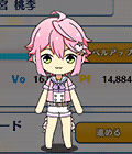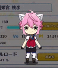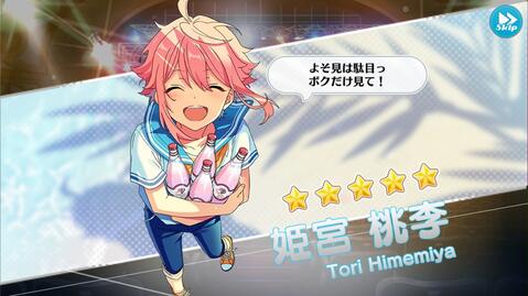 Tori is a very short boy with a small build. His hair is light pink and short, with longer sides on the front and a curved ahoge on top. His eyes are light green. He wears the school uniform with a slightly over-sized honey-colored sweater underneath the blazer. He also wears a bear key chain on his pocket. His shoes are pink sneakers with yellow accents and light blue laces.